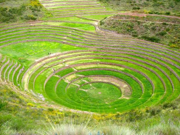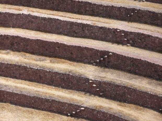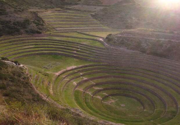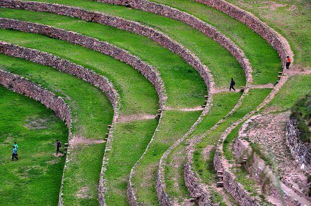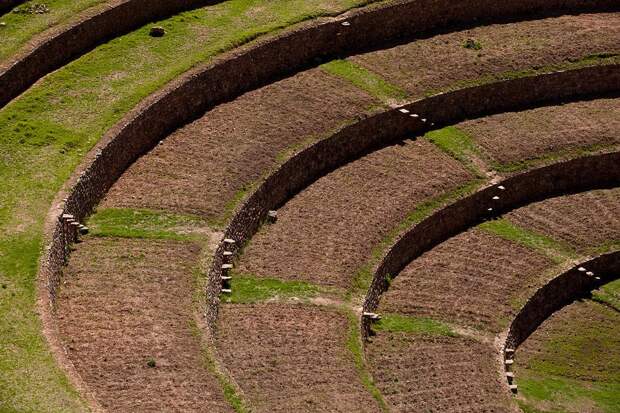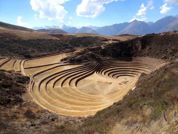 Древние цивилизации Центральной Америки оставили после себя не только культовые, но и сельскохозяйственные сооружения. Вот такие, прекрасно сохранившиеся террасы-колодцы, перепад температур на разных уровнях которых составлял до 15 градусов, находятся на территории города Морай в Перу.