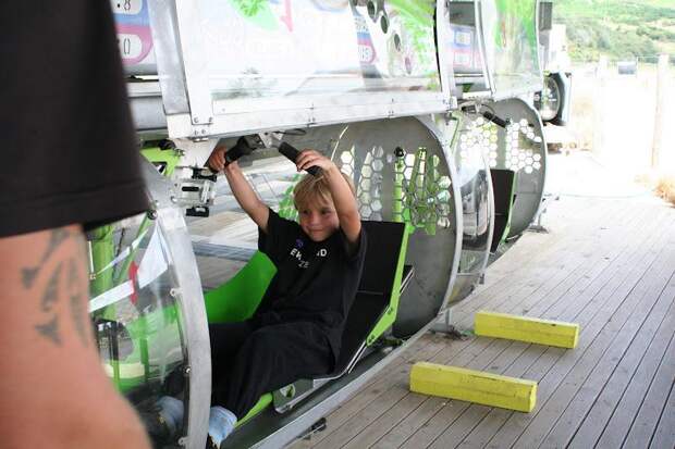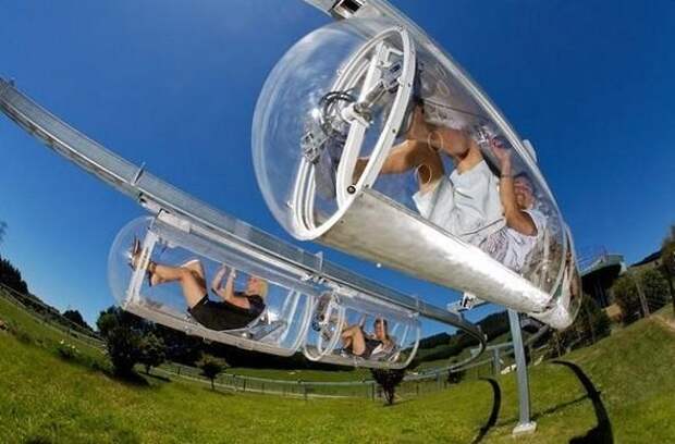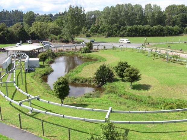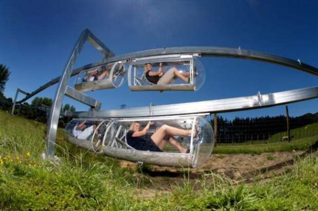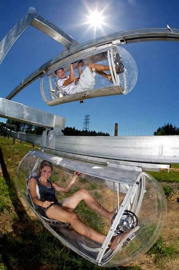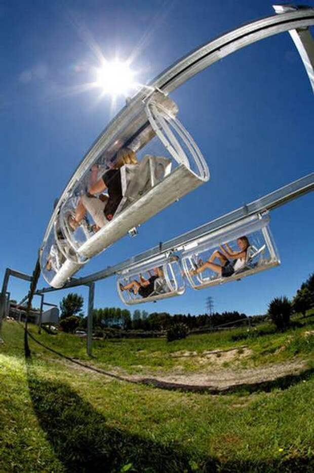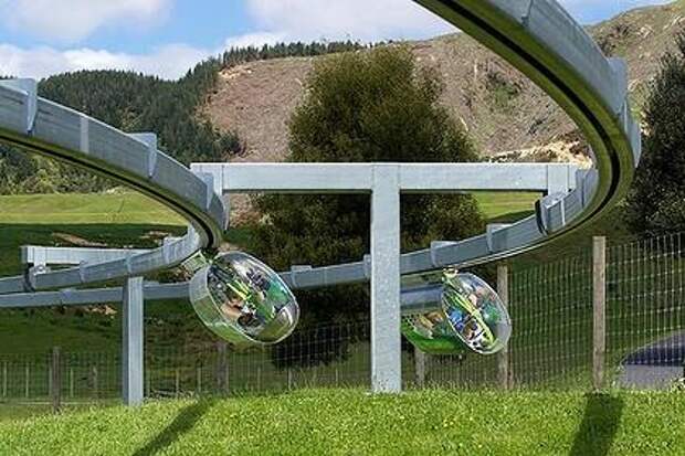 Парк Агродом в Новой Зеландии - это ферма, переоборудованная в парк развлечений. Одной из его особенностей является наличие индивидуального монорельса, позволяющего осмотреть окрестности, перемещаясь в прозрачной капсуле. Я вот лично не понимаю, в чем кайф, но новозеландцам, похоже, нравится.