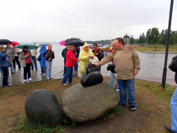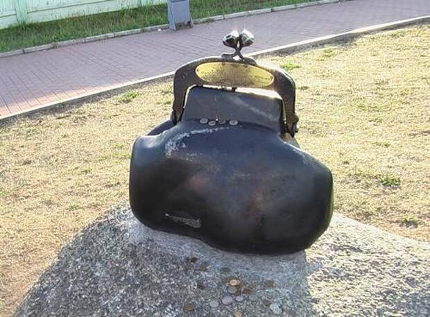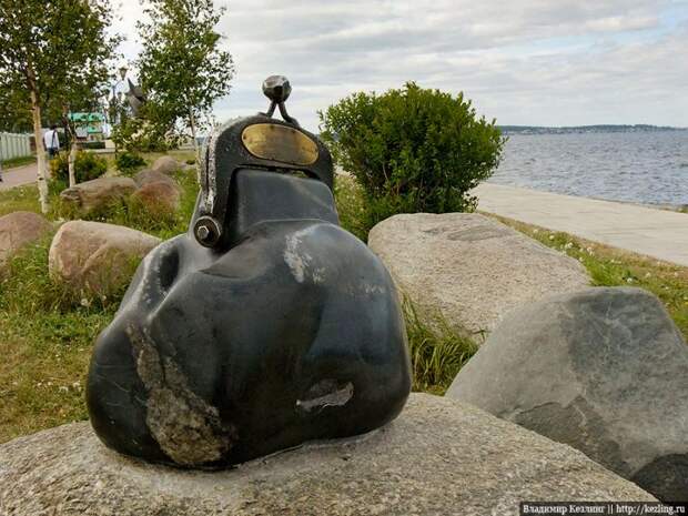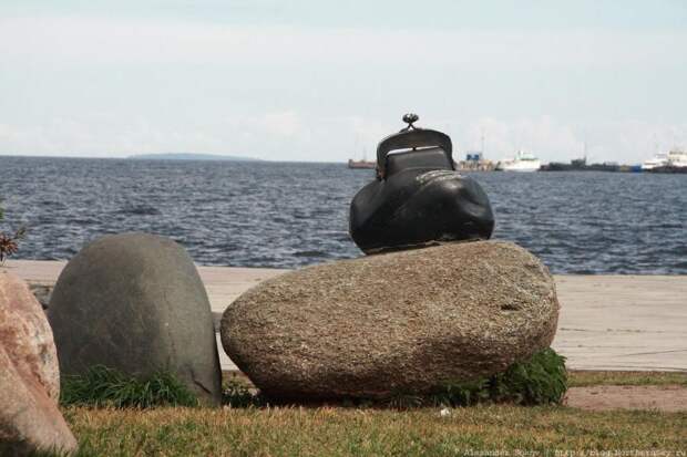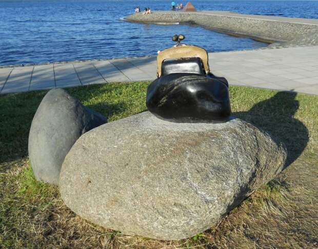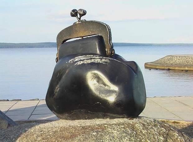 Памятник "Кошелек удачи" на Онежской набережной Петрозаводска - лишь наполовину творение человеческих рук. "Пузо" кошелька - это природный камень, просто немного облагороженный автором арт-объекта.