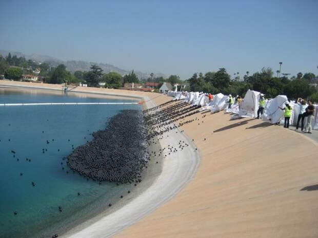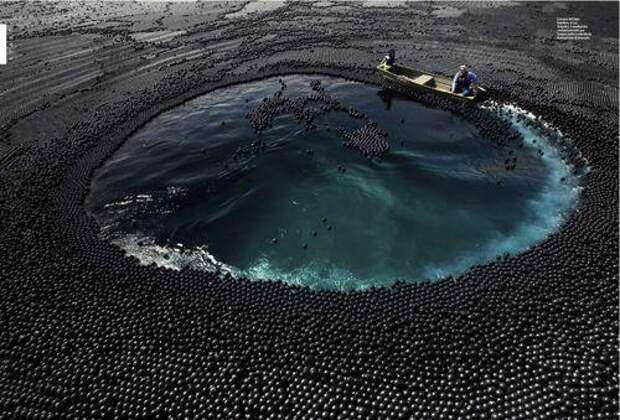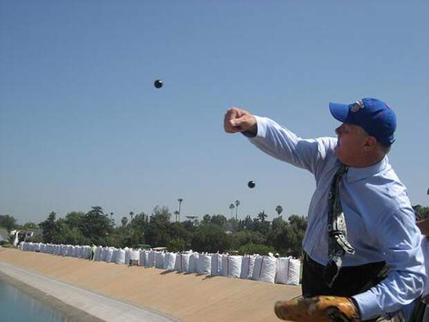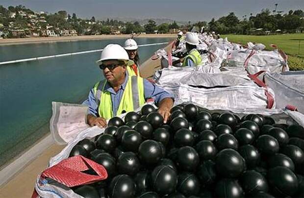 Несколько лет назад власти Калифорнии столкнулись с такой проблемой - в резервуаре Айванхо, обеспечивающем водой более полумиллиона жителей Лос-Анджелеса, под действием солнечного света стало образовываться токсичное соединение. На время строительства нового резервуара было найдено весьма необычное решение - поверхность Айванхо защитили от ультрафиолета 400 тысячами "птичьих" шариков (ими покрывают водоемы вблизи аэропортов, чтобы птицы не слетались) - получилось очень неординарно, быстро, просто и, главное, дешево.