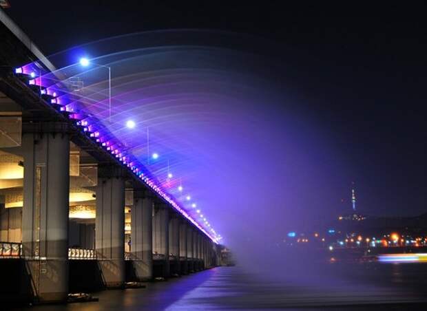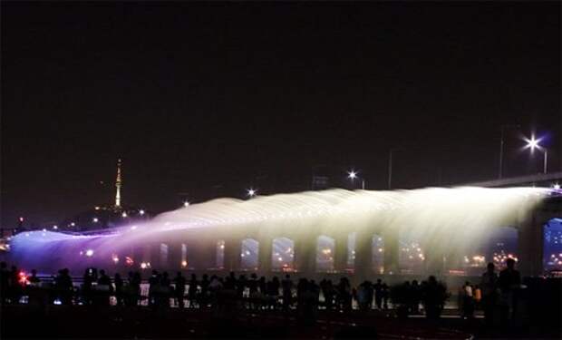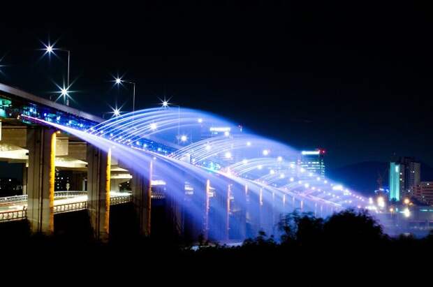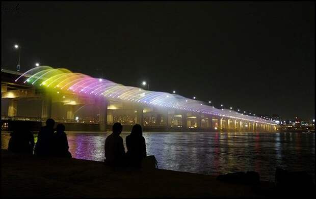 Представляем вашему вниманию один из красивейших мостов мира, внесенный в Книгу рекордов Гиннесса как самый длинный мост-фонтан - Банпо в Сеуле. Этот замечательный мост не только является достопримечательностью мирового масштаба, добавляет очарования и красоты южно-корейской столице и исправно выполняет непосредственные обязанности любого моста, но и оказывает благотворное воздействие на экологию, поскольку вода, используемая в фонтане, возвращается в реку уже очищенной.