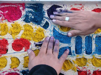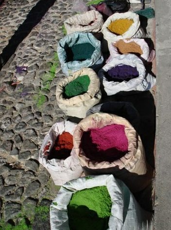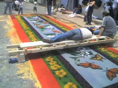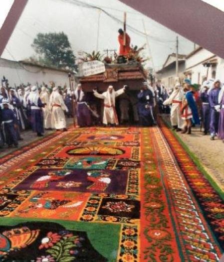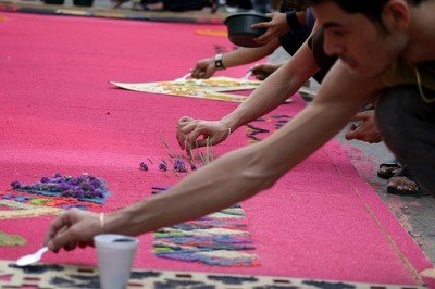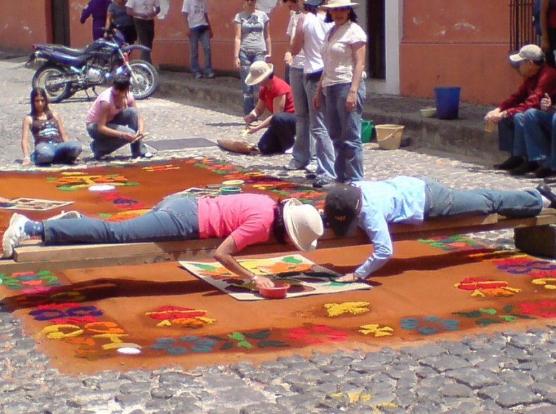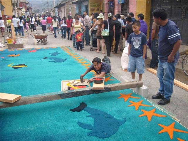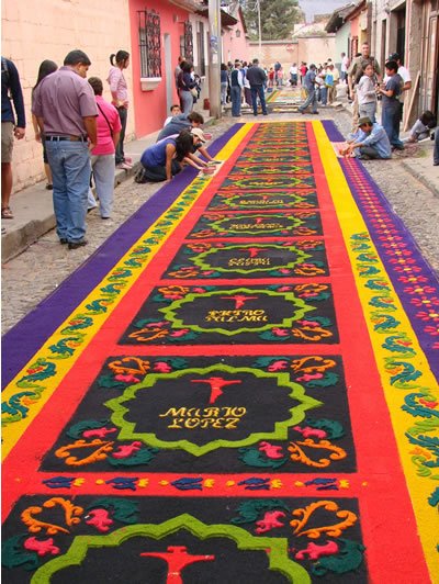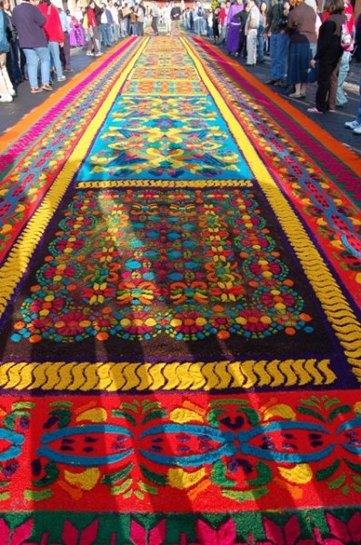 Вот такие удивительные ковры-полотна ежегодно появляются на улицах Гватемалы на Страстной Неделе (естественно, католической). Традиционным материалом для них являются цветные опилки, но никаких запретов и ограничений на творчество не существует и вполне можно увидеть также овощные или цветочные ковры.