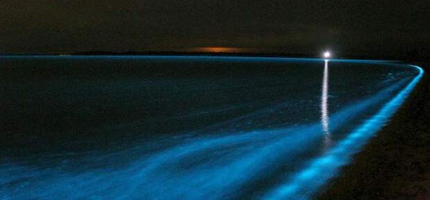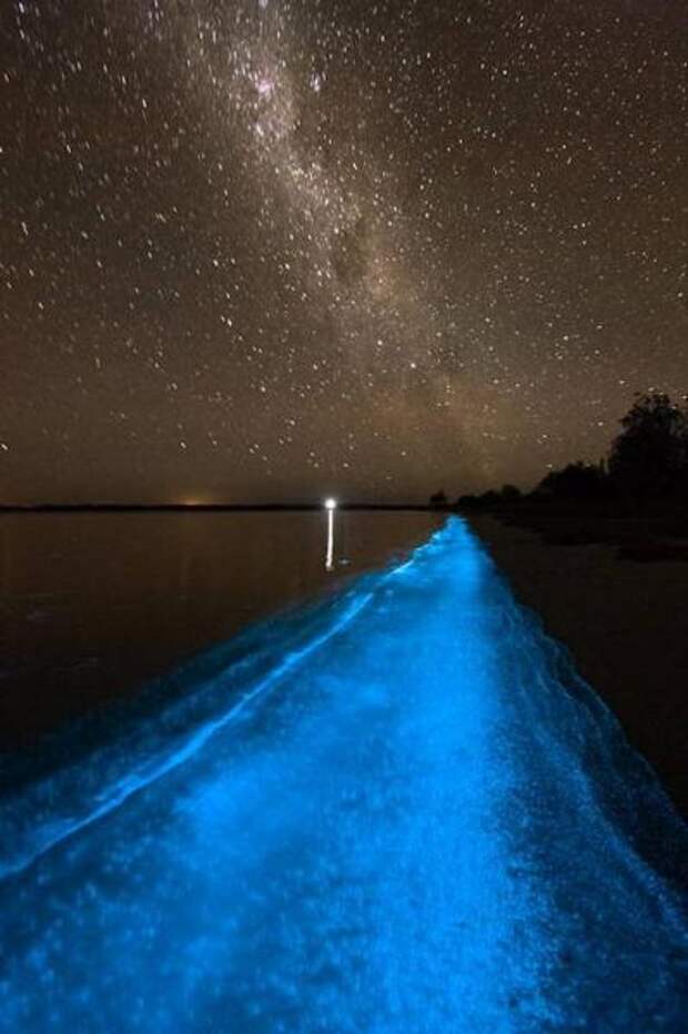 Мы уже писали о светящихся кальмарах в японских водах. А вот такие фото вод австралийского озера Гипсленд удалось сделать в период резкого увеличения в них количества особых люминесцирующих микроорганизмов.